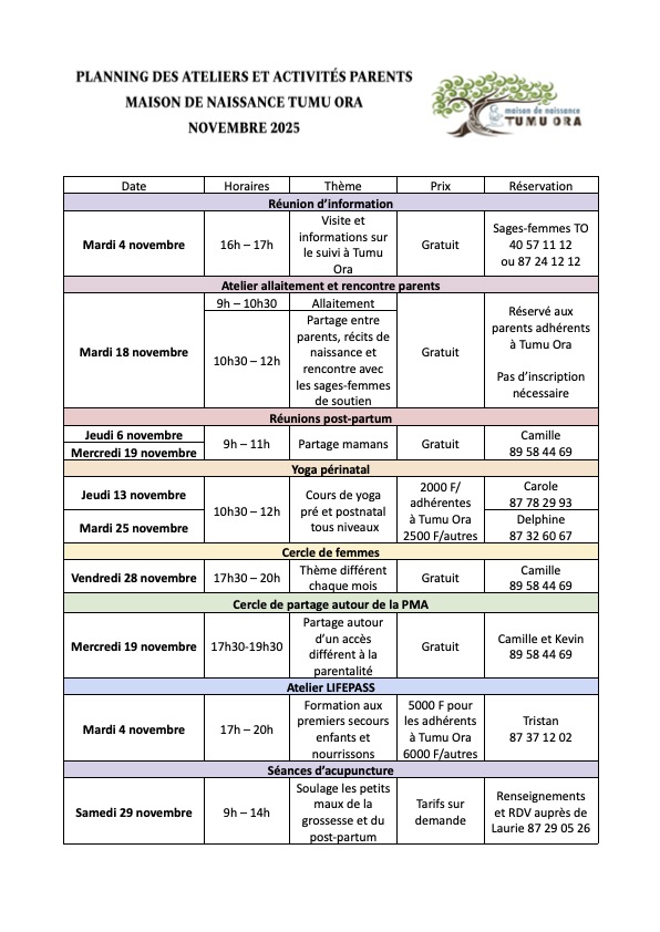 Notez qu’il n’y aura pas d’ateliers Naître en Polynésie le 2ème mardi du mois car il est férié (11 novembre).