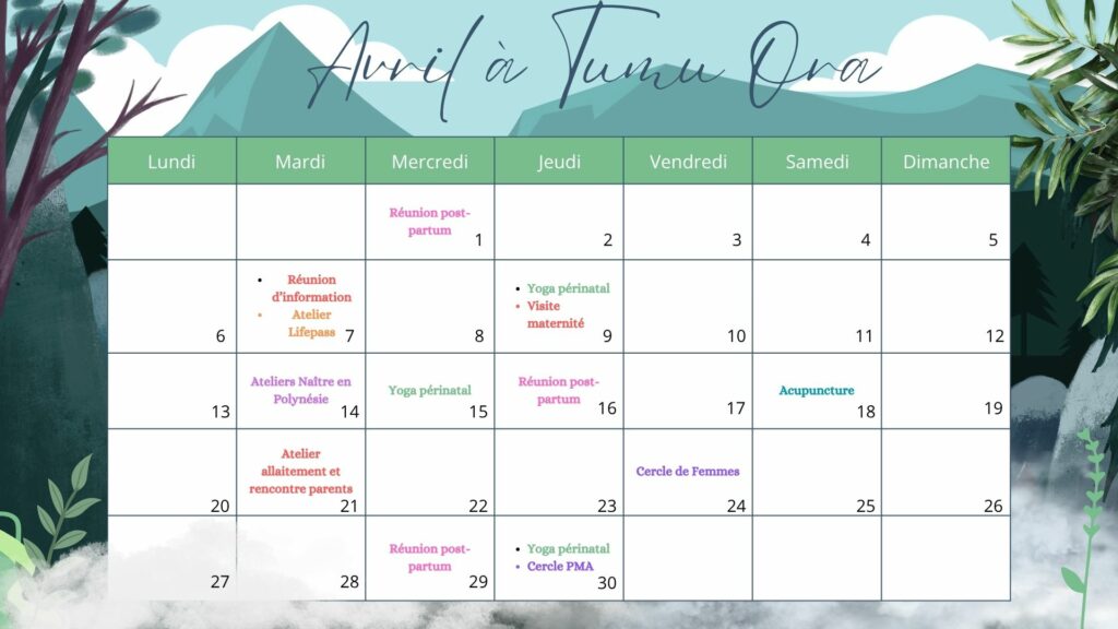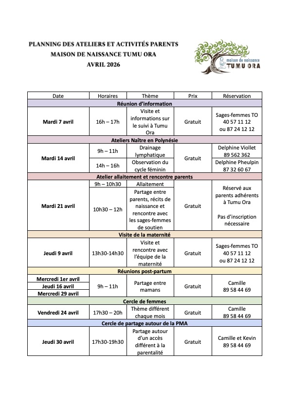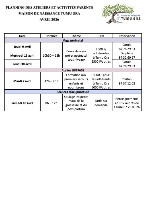 Et comme d’habitude, les ateliers Naître en Polynésie du 2ème mardi du mois, l’atelier partage parents et allaitement le 3ème mardi du mois et les séances de yoga périnatal ainsi que l’atelier Lifepass avec Tristan dès demain !